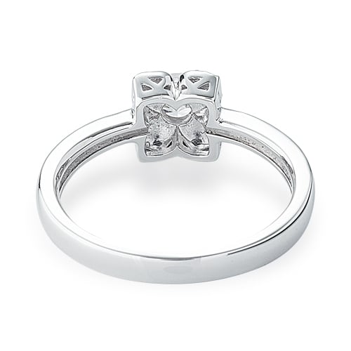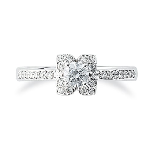 花冠のように立体的に重なり合うダイヤモンドのモチーフが、中央の一粒を気品ある光で包み込むデザイン。
